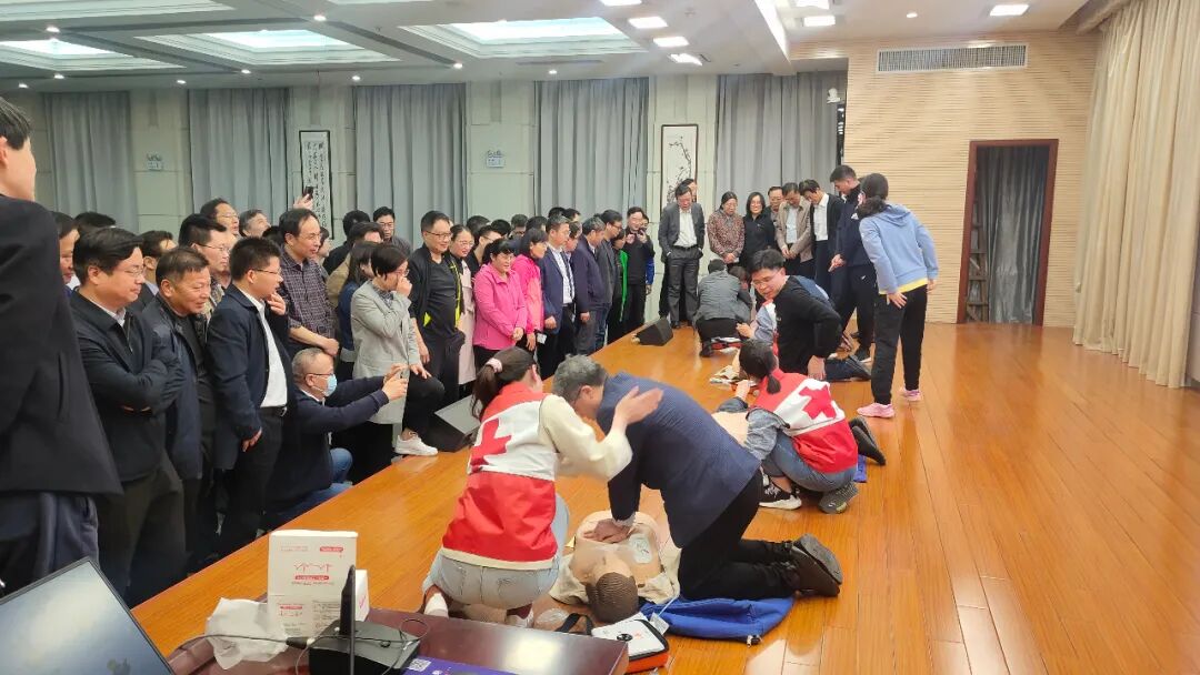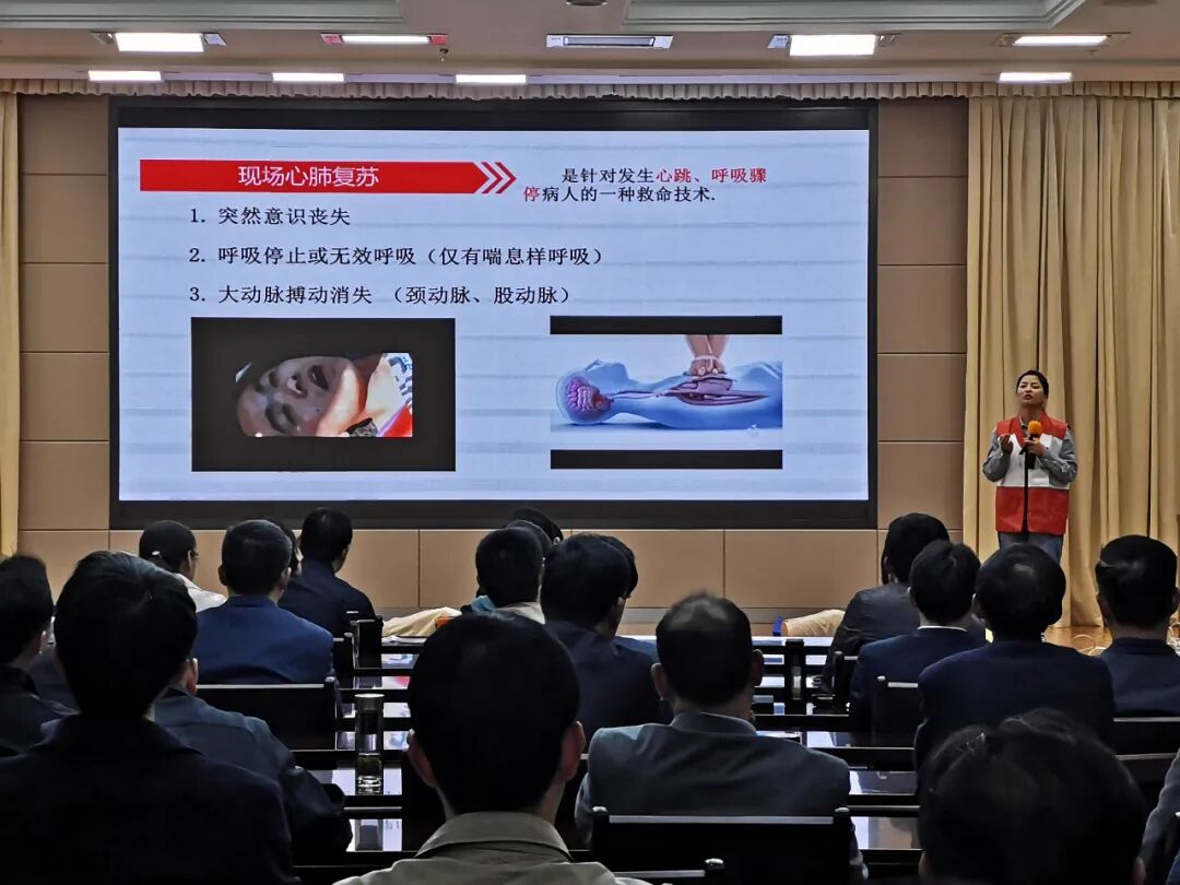 培训老师用通俗幽默的语言介绍了应急救护的基本知识,详细讲解了心肺复苏的现场救护应急知识和基本操作流程,并利用人体模型进行了心肺复苏术、人工呼吸法等紧急救护的现场演示。随后,又邀请大家上台参与心肺复苏实操演练,帮助大家掌握急救技能。