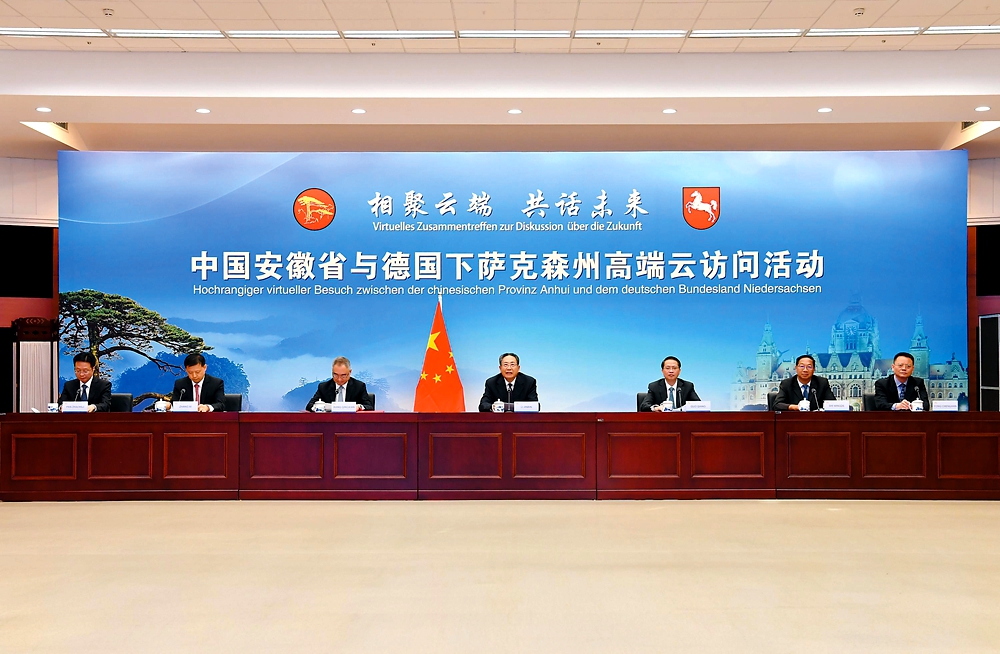 中安在线、中安新闻客户端讯7月16日下午,安徽省与德国下萨克森州以视频方式举行“相聚云端 共话未来—中国安徽省与德国下萨克森州高端云访问活动”。省委书记李锦斌、下萨克森州州长施特凡·魏尔、中国驻汉堡总领事杜晓晖、德国驻上海代总领事唐孟思出席活动并致辞。省委副书记、省长王清宪与魏尔线上签署了《中华人民共和国安徽省人民政府与德意志联邦共和国下萨克森州政府关于进一步深化友好省州关系合作意向书》并互赠礼品。下萨克森州食品、农业和消费者保护部部长芭芭拉·奥特-基纳斯特,州政府国务秘书兼州政府办公厅主任约尔格·米尔克,省委常委、省委秘书长郭强,省政府副省长章曦,中德友好协会会长史明德出席活动。
