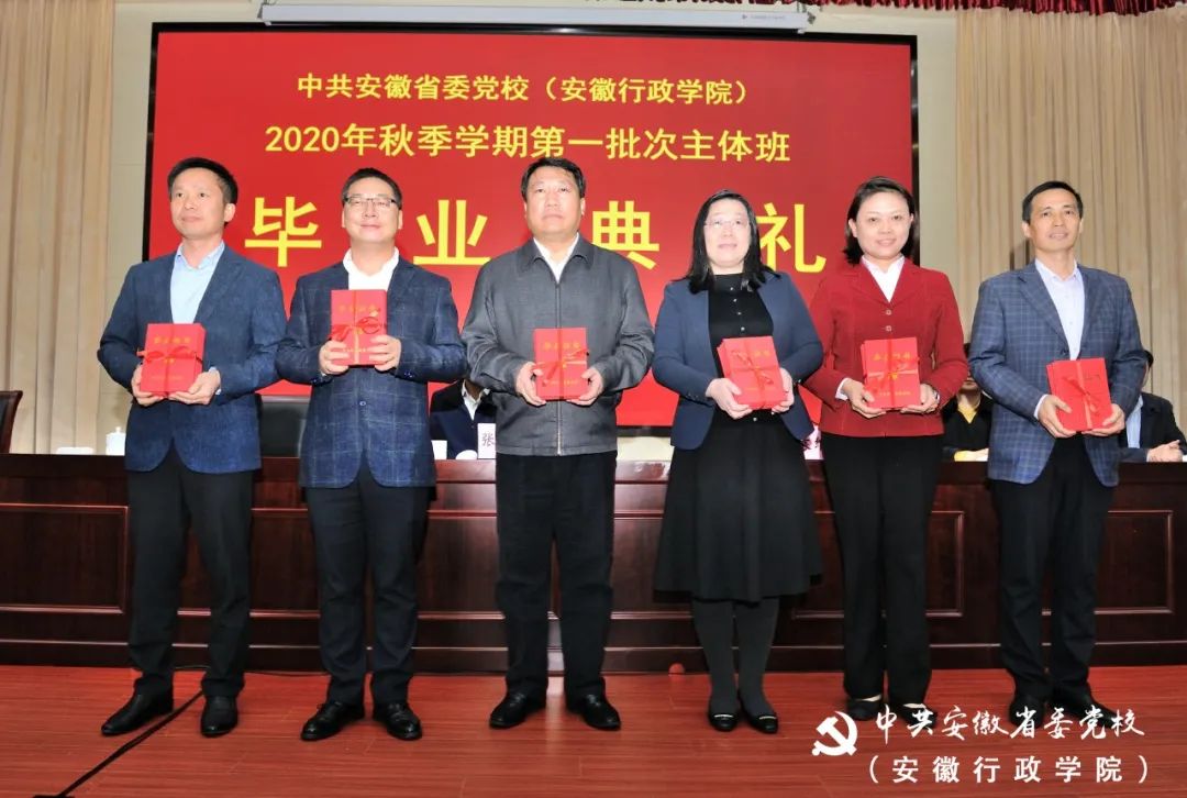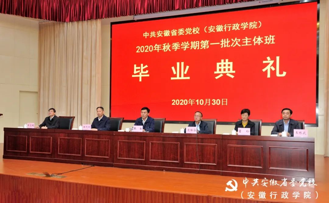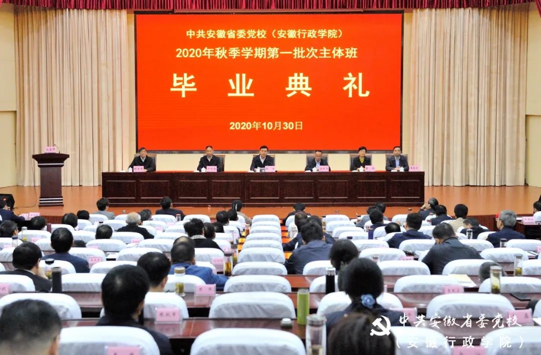 10月30日上午,省委党校(安徽行政学院)举行秋季学期第一批次主体班毕业典礼。常务副校(院)长张永讲话,副校(院)长袁维海主持,副校(院)长江观伙、童玲、胡忠明、王林武出席,第77期市厅级干部进修班、第69期县处级干部(经济发展、社会治理)培训班全体学员和校(院)有关处室负责人等参加毕业典礼。